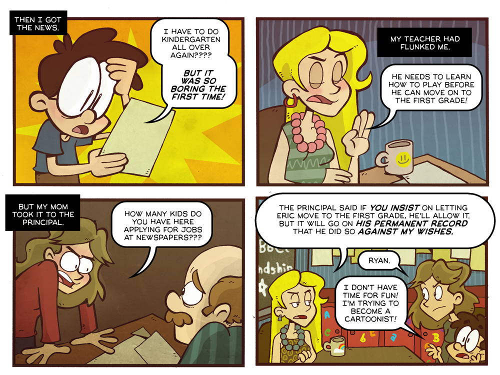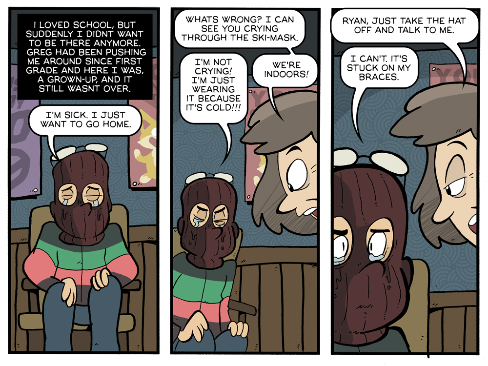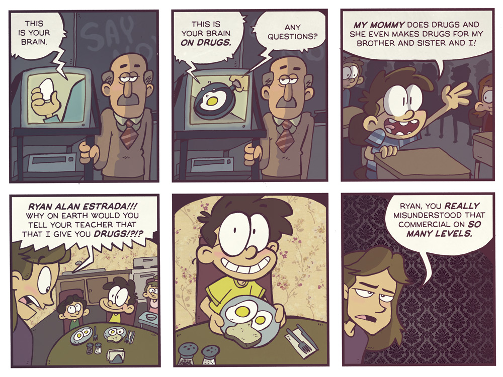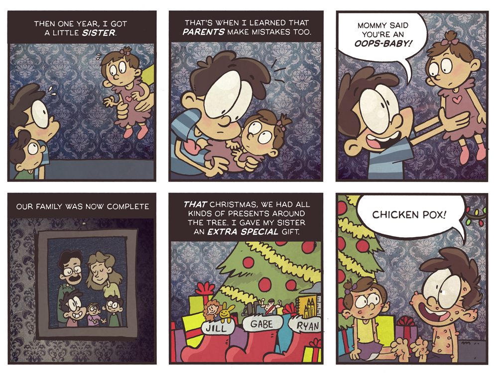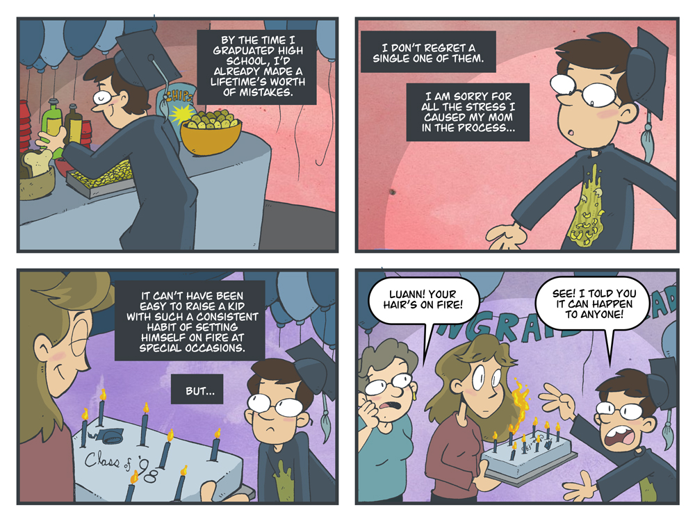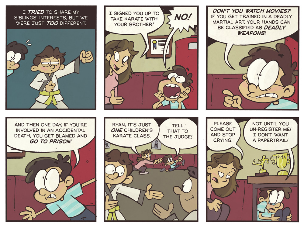 | Ryan Made Mistakes is a selection of stories about the dumb things I did as a kid. It was originally published as a daily webcomic for Hiveworks. |